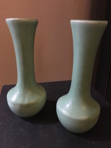 From there, I hit the thrift stores with a mission: I became a green pottery go getter. Names like McCoy, Haeger and Treasure Craft replaced Chanel and St. John. I graduated to top-shelf studios like Weller, Roseville, Rookwood and Francoma. I discovered California Potteries. My shelves filled up.